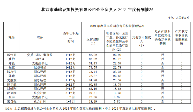 北京市基础设施投资有限公司企业负责人2024年度薪酬情况
